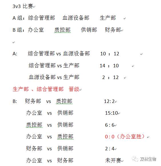 B組:辦公室 2勝0負,財務(wù)部1勝1負,供銷(xiāo)部1勝1負1平,質(zhì)控部2負一平