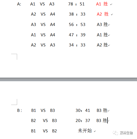 A組:A1 A2分別凈勝2場(chǎng),負0場(chǎng),A3勝1場(chǎng)負2場(chǎng),A4負3場(chǎng)。